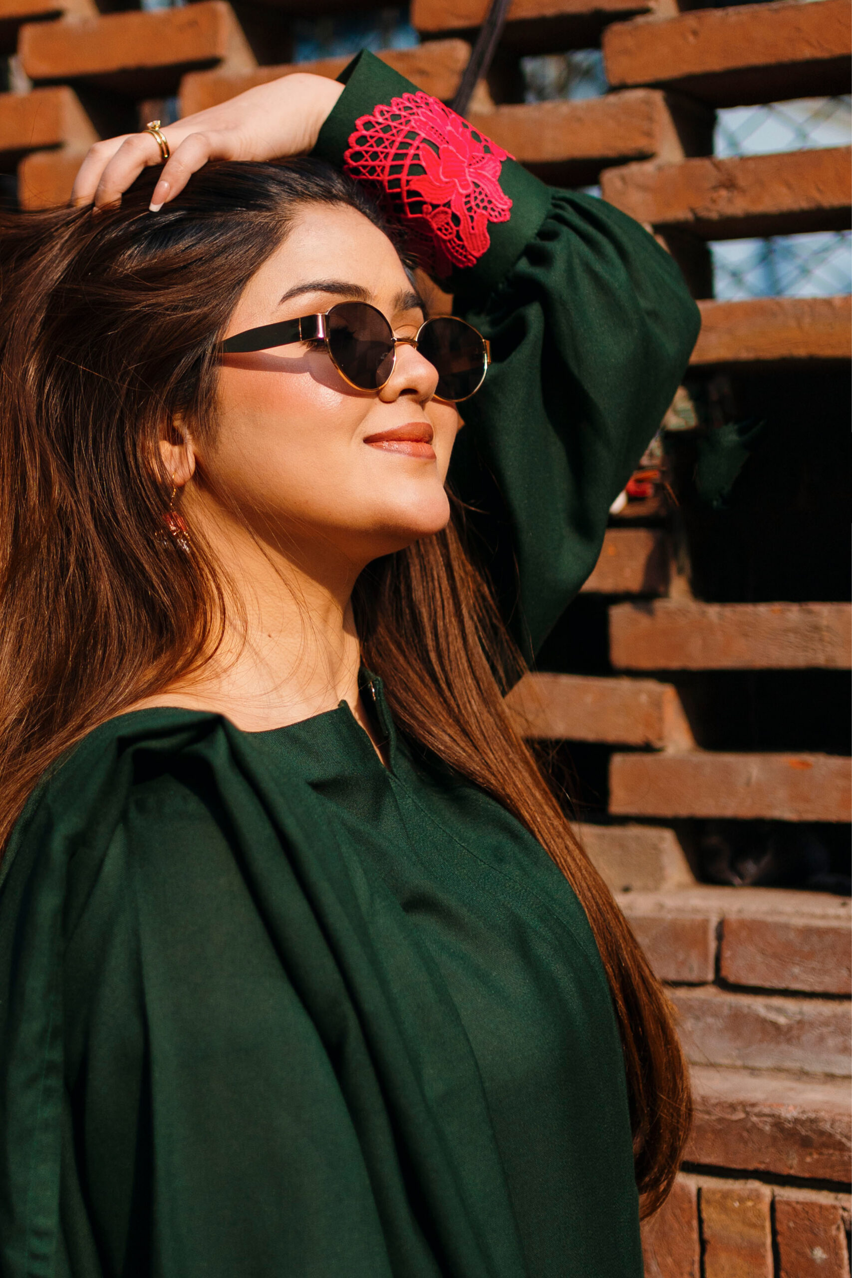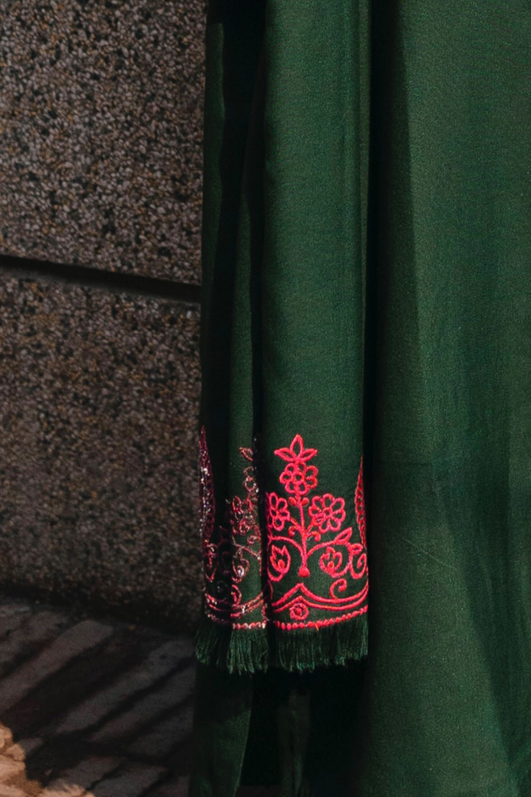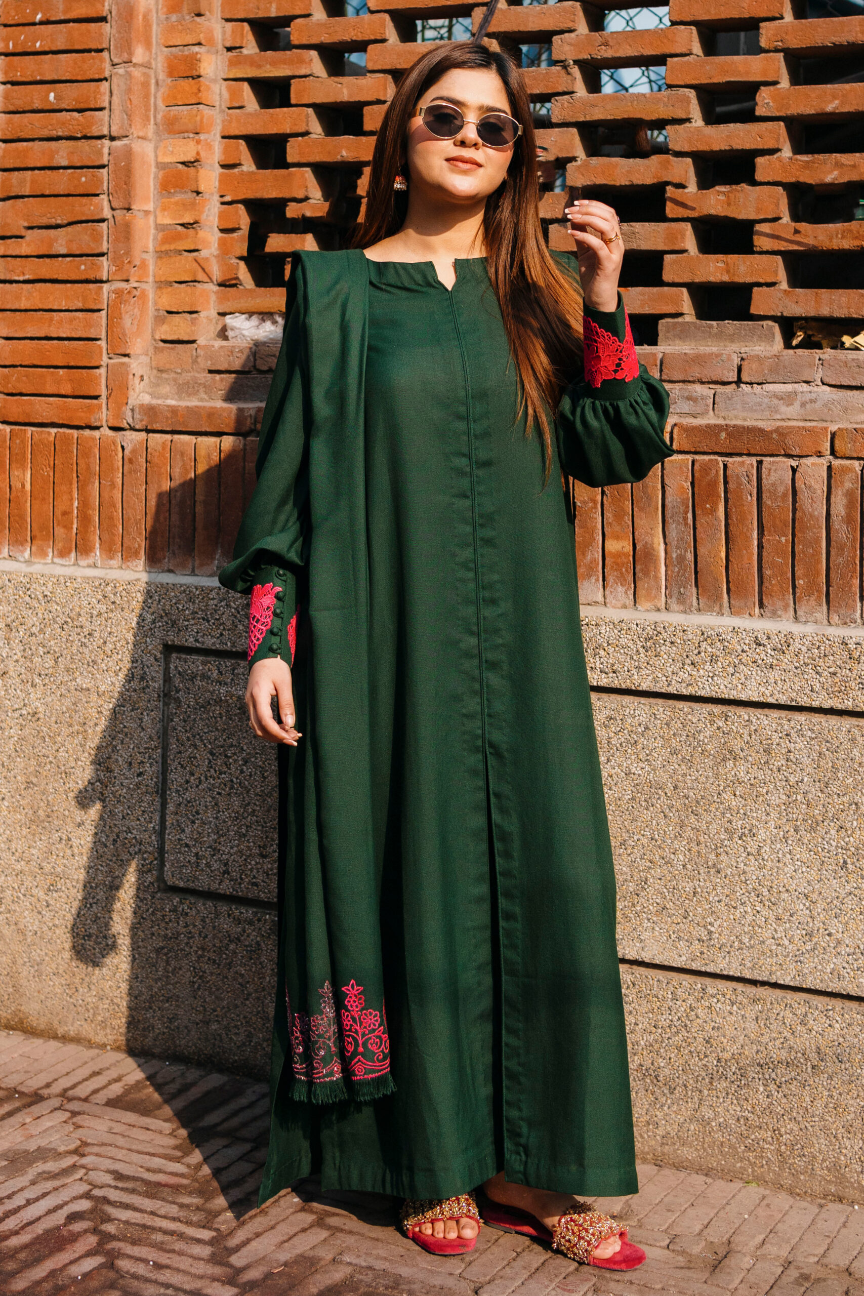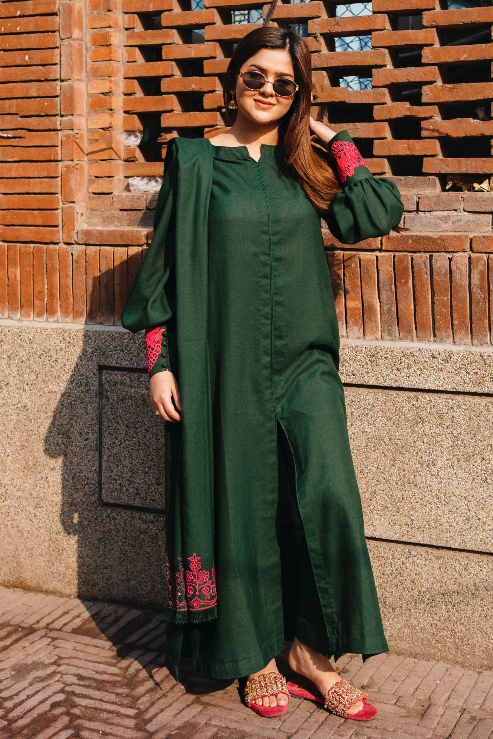 Vibing in green. Long open shirt, straight pants, and an embroidered shawl that’s giving major elegance! Pink pop cuff detailings add the perfect touch.
