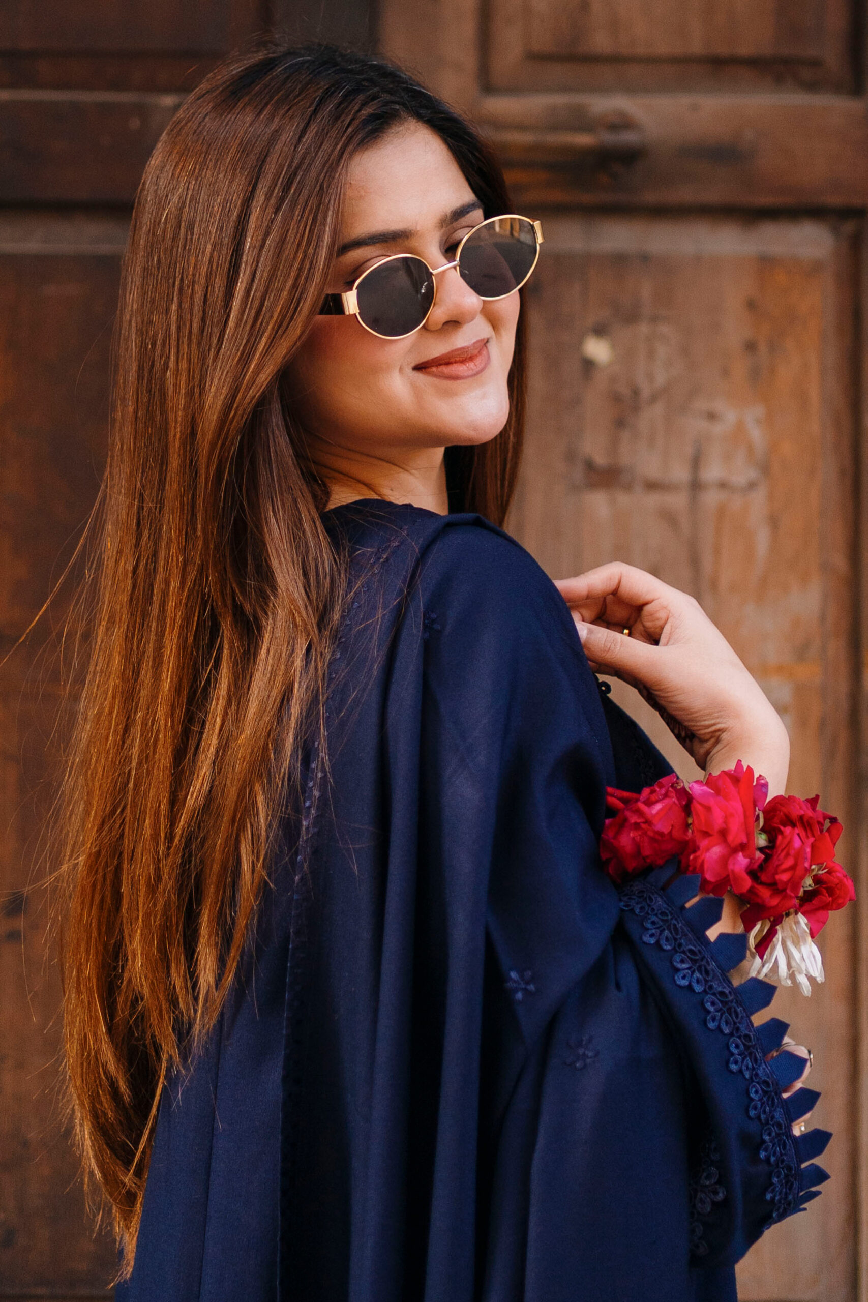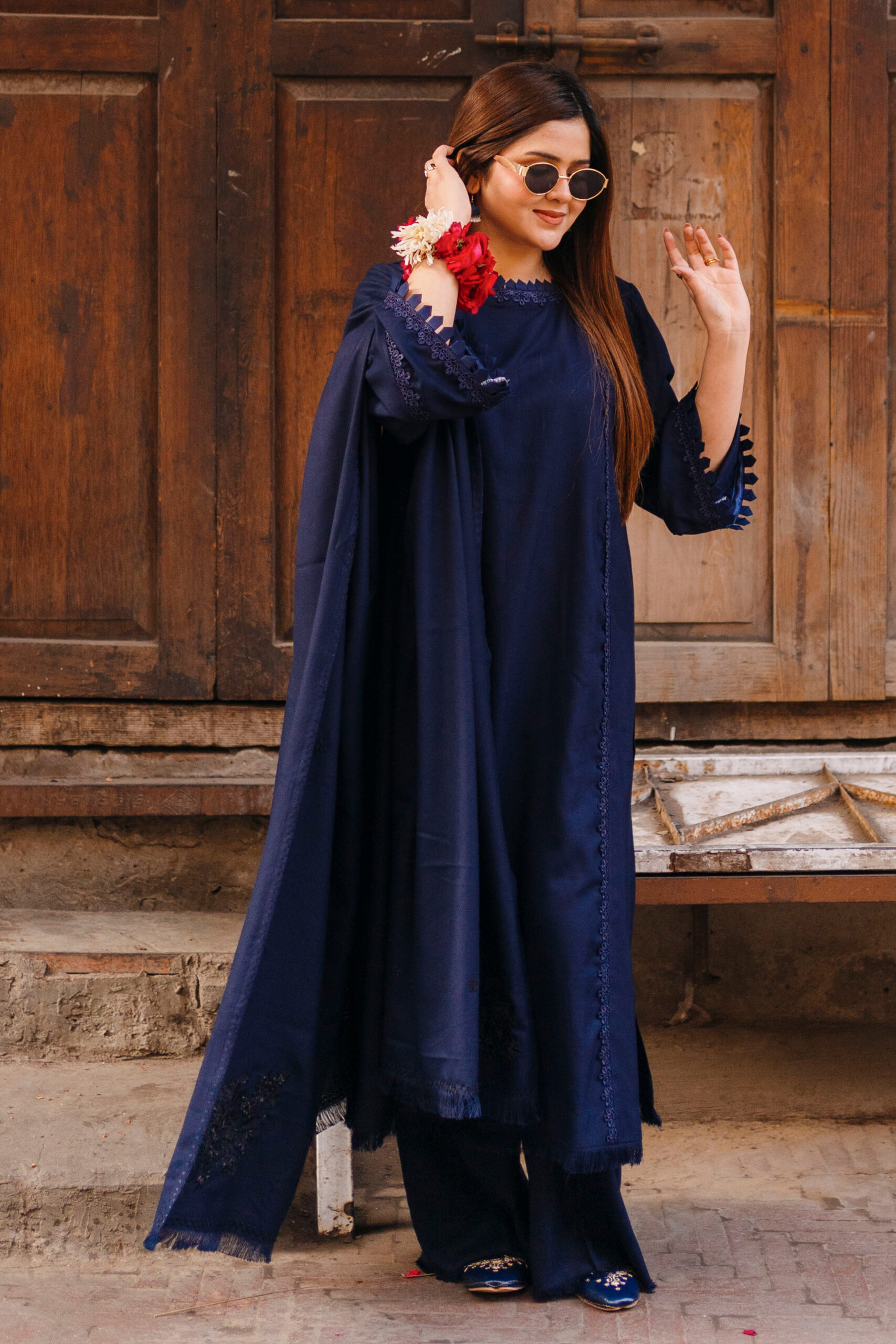 A beautifully crafted dress with an embroidered shawl featuring mirror work, paired with a paneled loose-cut shirt and straight culottes. The boat neck and loose sleeves are accentuated with delicate lace finishing, adding a touch of elegance to the overall look.