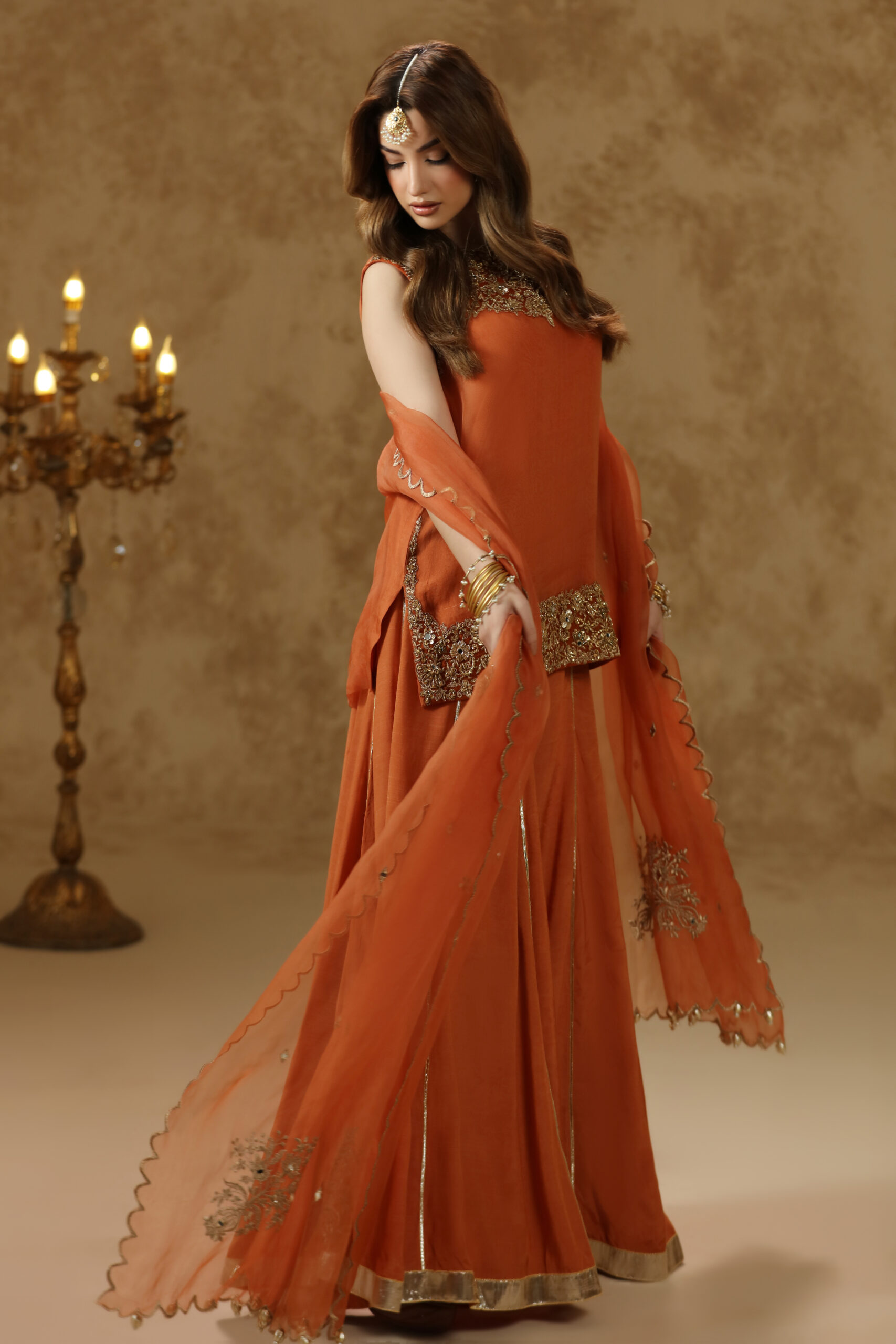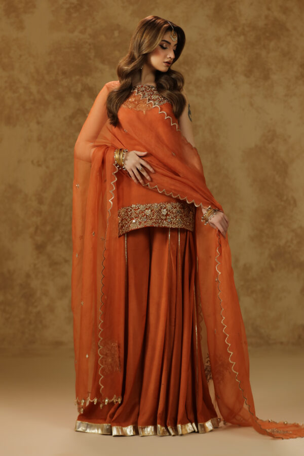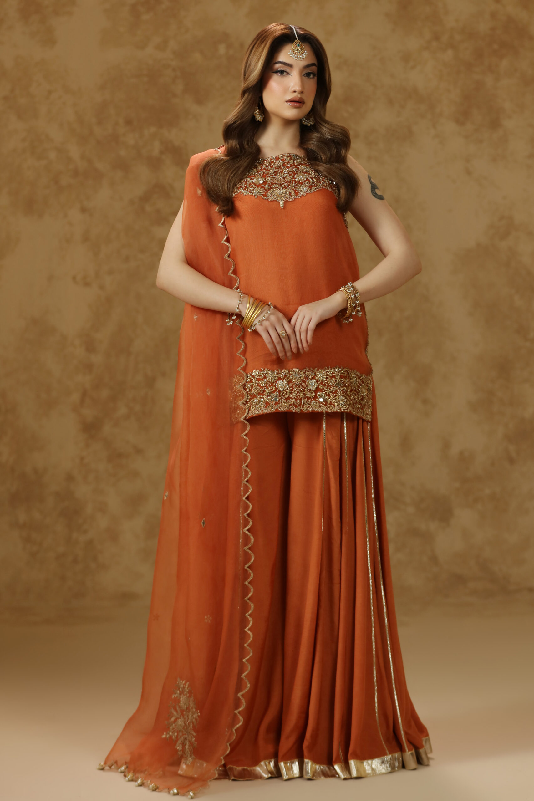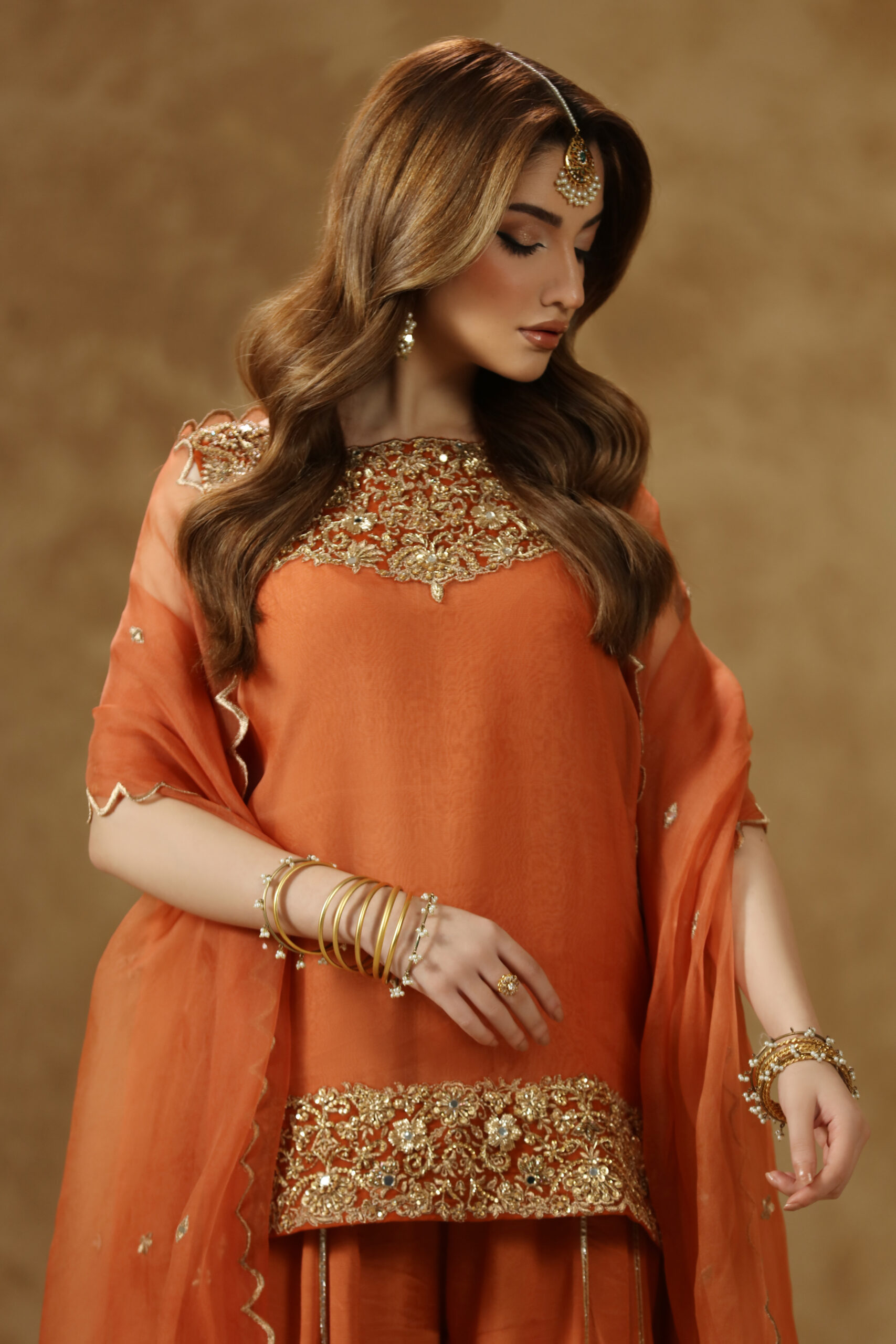 A short shirt adorned with intricate work on the neckline and hem, paired with a beautifully paneled sharara and an organza dupatta, a perfect balance of tradition and modern elegance.