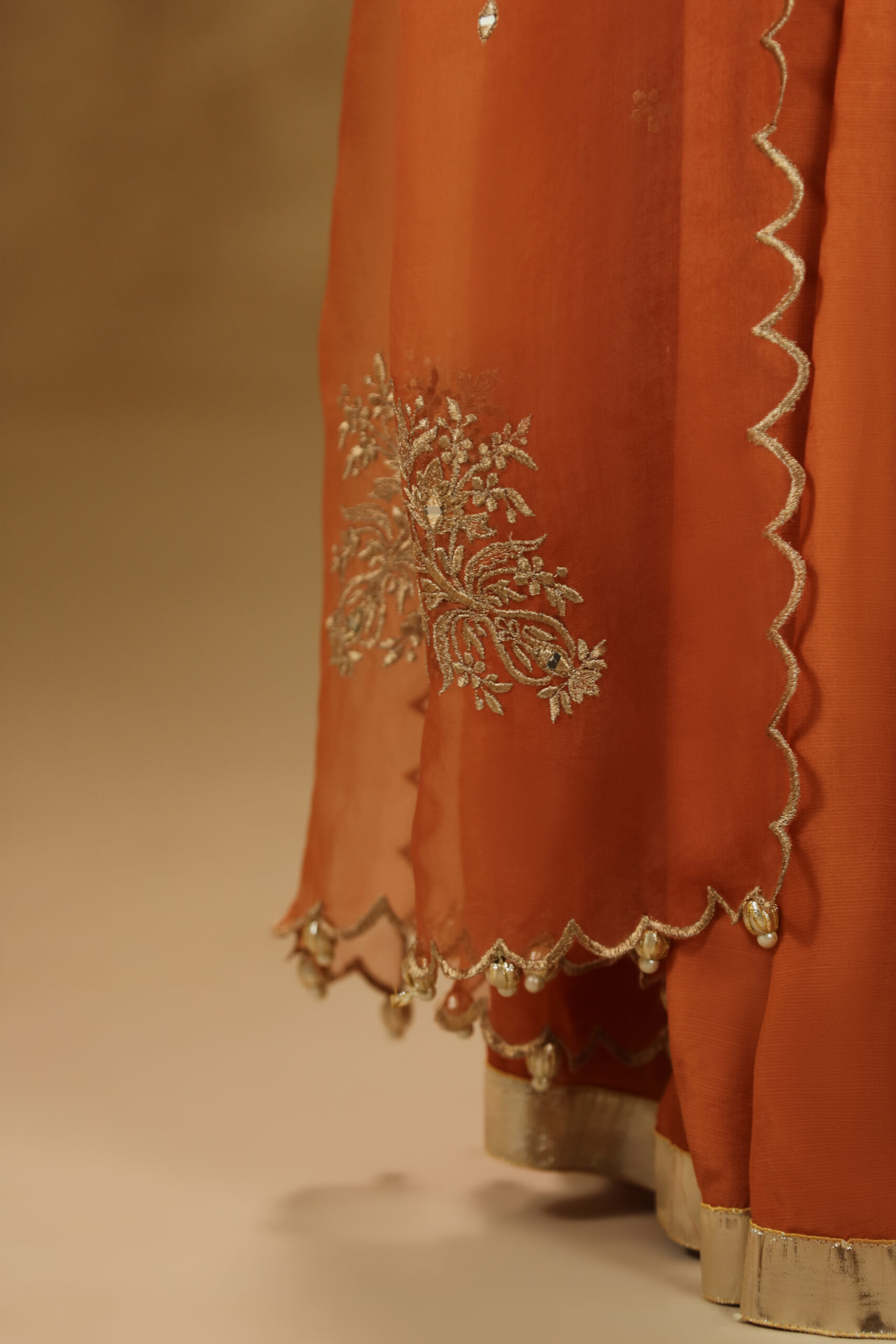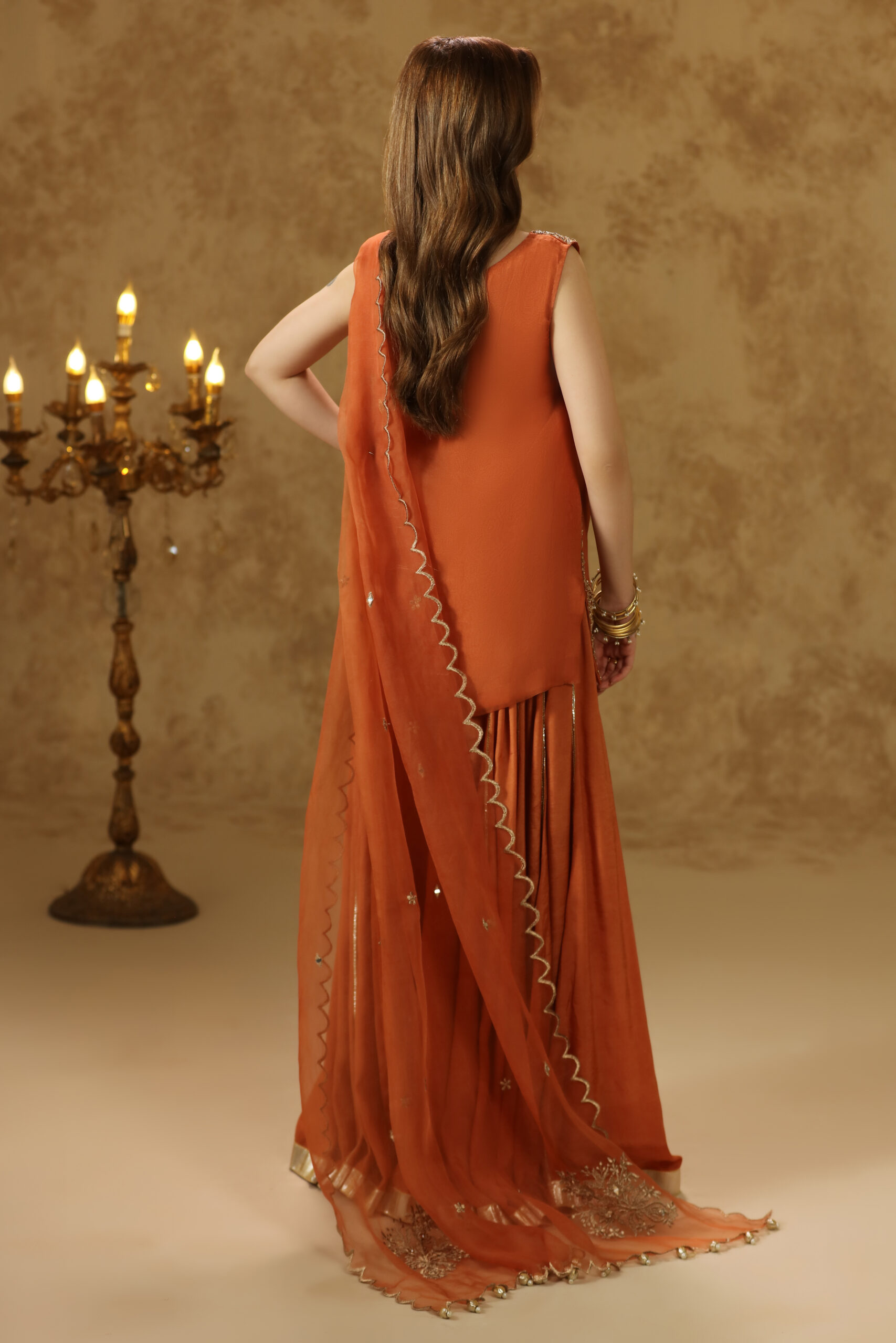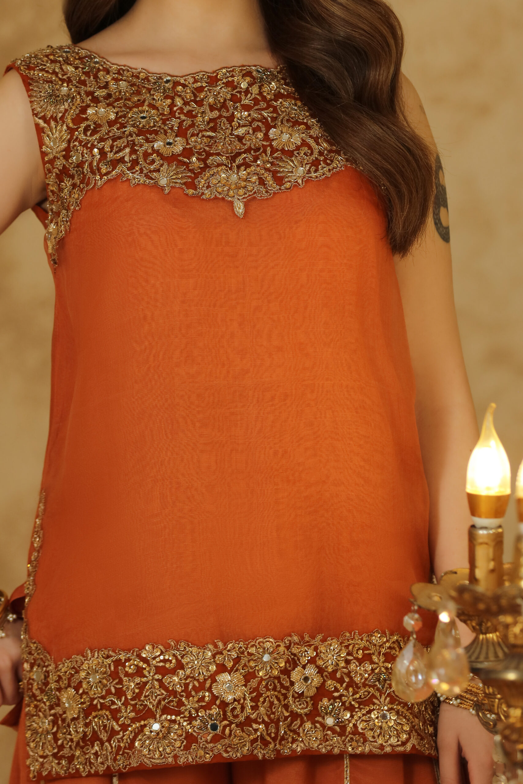 A short shirt adorned with intricate work on the neckline and hem, paired with a beautifully paneled sharara and an organza dupatta, a perfect balance of tradition and modern elegance.