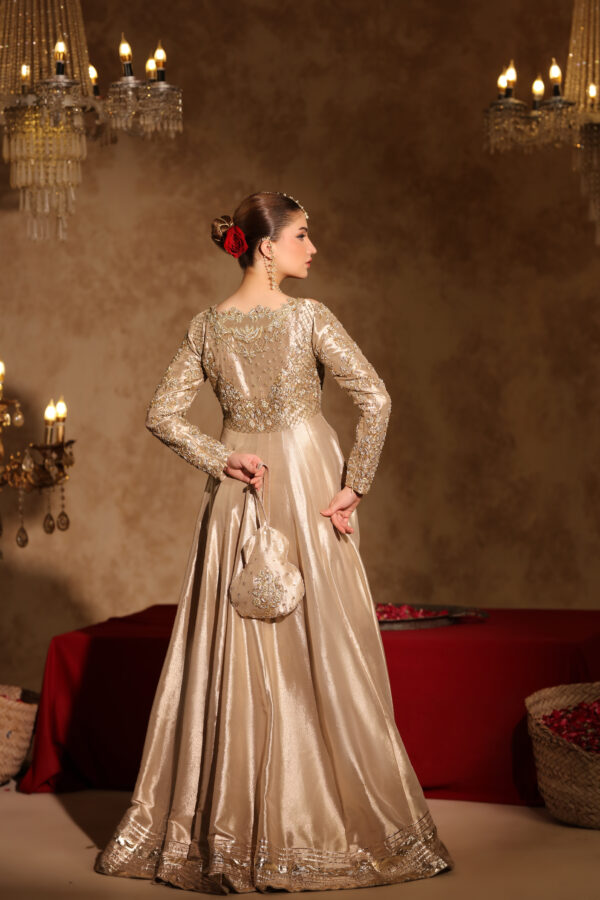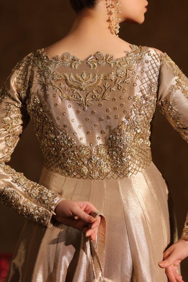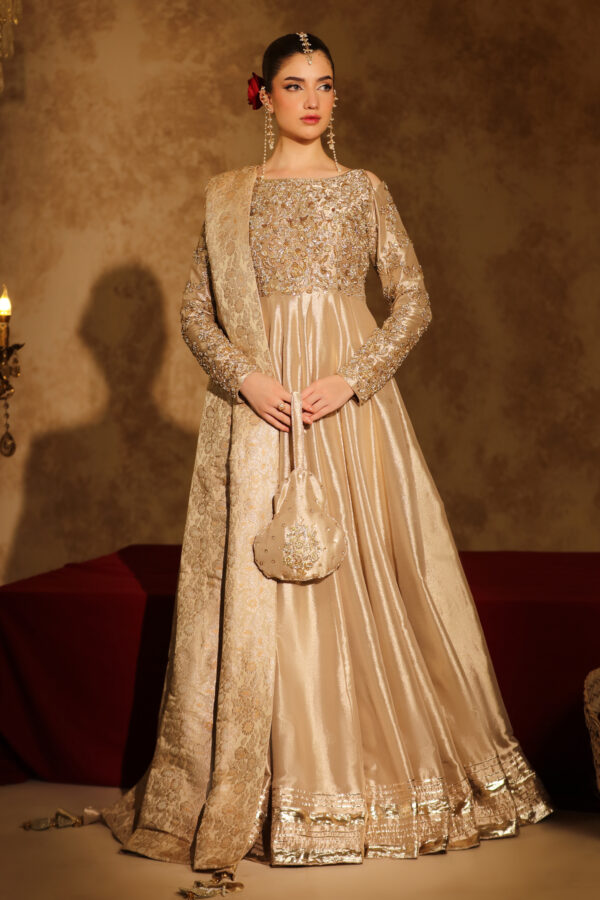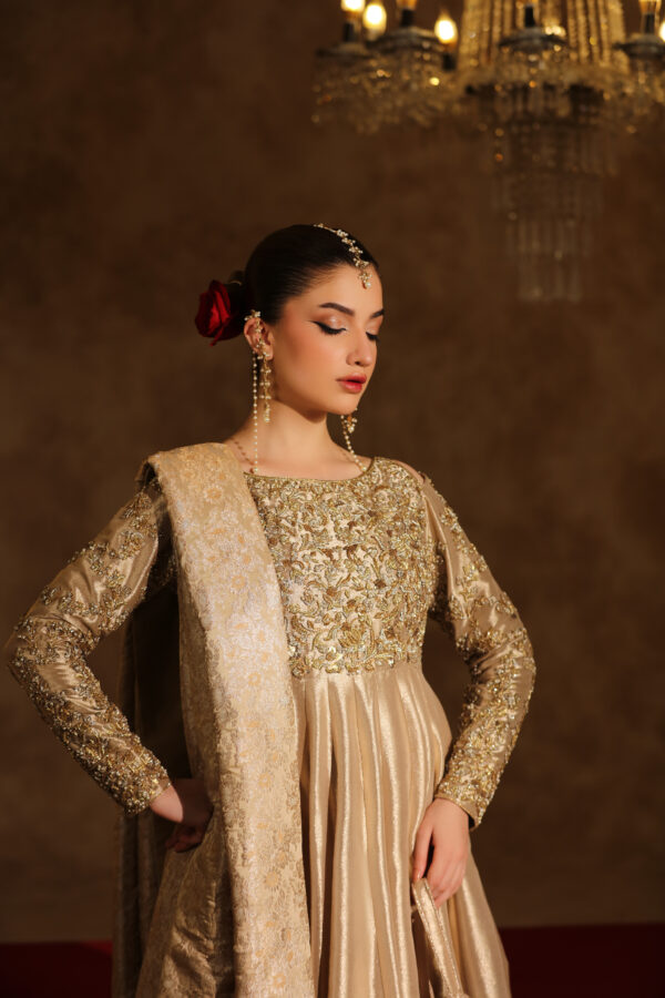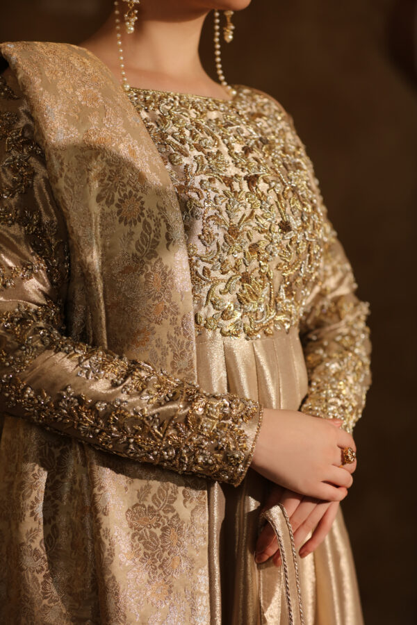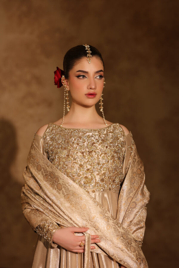 A majestic gold lama tissue pishwas boasts a fully hand-embellished bodice and sleeves with breathtaking intricate details, paired with a luxurious jamawar shawl that elevates the outfit’s royal essence.
